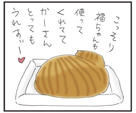おかえりなさ~い。体調は如何ですか?まめ君可愛いぞーふくちゃんより小さいんかな?てきとーとおっしゃってますが(笑)愛情タップリオザブ!どんな高級Bedより素敵よね~