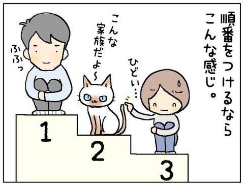 うちは、私が、第一位、にゃんこが、二位、主人は、三位でした。夕食に魚が出ると、主人の、魚を、食べてから、自分(にゃんこ)のを食べていました。