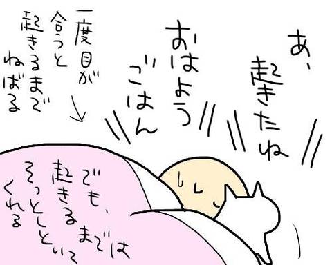 猫ちゃんは朝が早いですものね(*^-^*)以前ウチにいた猫ちゃんも一度目が合うと「起きて」とおててで私の首をポンポンしていました(*^-^*)