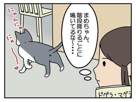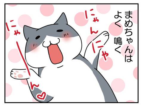 よく鳴くまめちゃんかわいい(*^-^*)ウチにいたにゃんこも私のベッドに上がる時に「にゃっ」って言って上がってました(笑)あれはなんなんでしょうね(*^-^*)