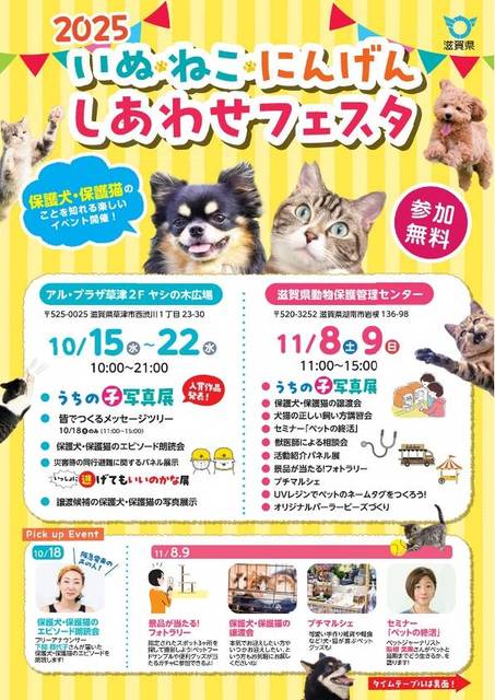 ペットの終活セミナー、犬・猫の正しい飼い方講習会、保護猫譲渡会、獣医師による相談会、フォトラリー、ワークショップの他、びわ湖わんにゃんマルシェも同時開催します。