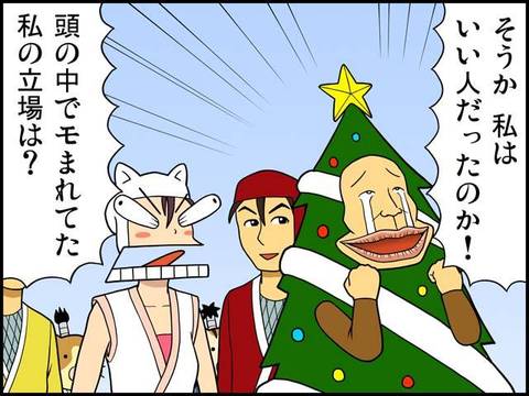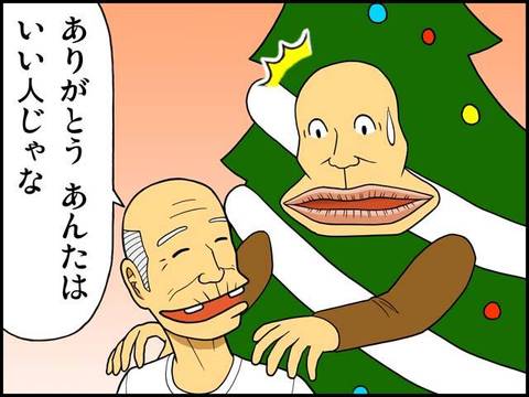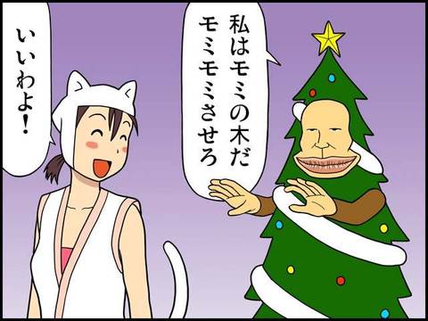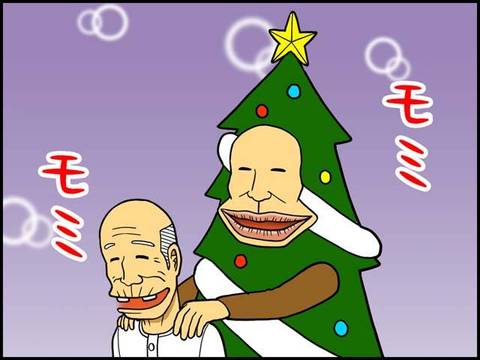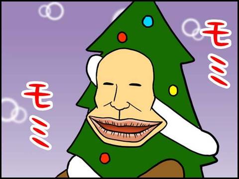 なんやちょっと時期ズレとんのとちゃうか? ま、でもおもろいやん。しかし、よう考えつくのう。「冬さん」がツリーでも門松でええやんか。 多分この作者はん、この唇が好きやねんな、ハハ。
