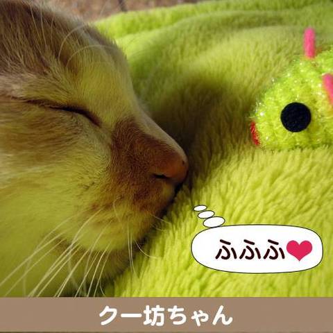 クー坊ちゃん幸せそうに寝てるね。毛布も黄緑、おもちゃも黄緑、そしてクー坊ちゃんのお顔も黄緑になってるね。