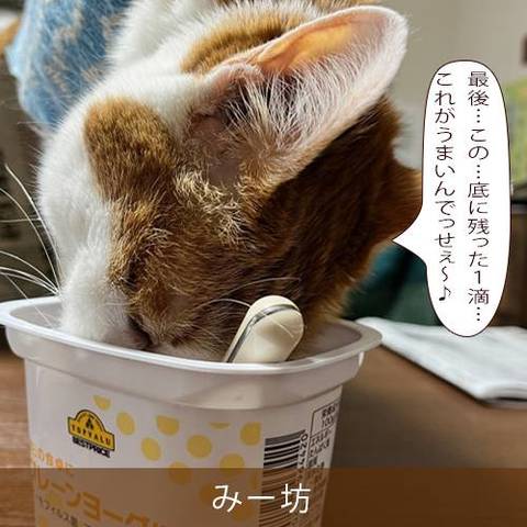 みー坊は、ヨーグルトの残りを舐めるのが大好きだもんね