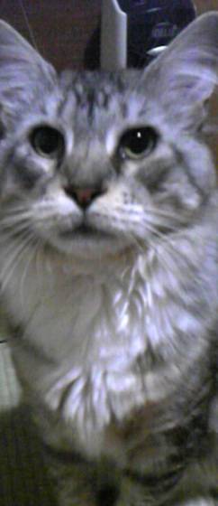 シルバータビーの毛色、オス去勢済み、7kgくらいの体重です。1歳半くらいの年齢です。