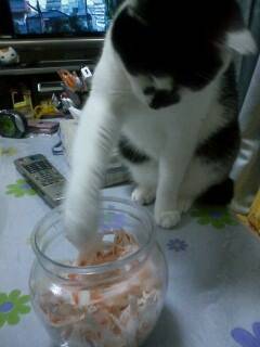 カニカマのおやつが好きで…いつもさいそくして、目の前まで転がしてきます