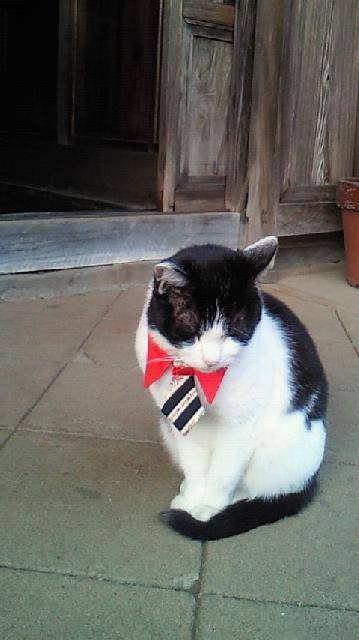 あはははは…。いらっしゃいましたの?って感じいいな~うちのは、首輪とか絶対につけさせてくれないですよ。ネクタイなんて、面白いです。そういうのが売ってるんですね(笑)