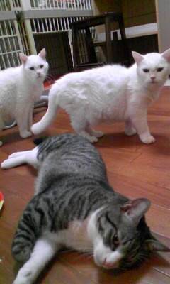 後ろの白猫ちゃんがあ~あって感じで見てますね。二匹ともそっくりですね、兄弟ですか?