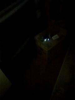 台所に置いてあったダンボールの中へ。撮ったら、ありゃぁ…真っ暗!ピカ~ンと、目からビーム(笑)