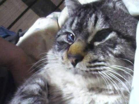 みなさんコメントありがとです。ネネさん、このあとはまた丸くなって寝てしまいました。チャーチャンさん、うずらちゃんに似てるんですか?うちのちゃあでよければなんぼでも見て下さいな。げべさん、ライオン丸!昔アニメでありましたね~。あら、歳がばれちゃう(笑)。エミさん、ちゃあの子供の時は今よりもっとかわいかったのです。たぶんシャム猫とのミックスなんですよね。子猫の時はシャムのように顔の真ん中、耳、手足だけがうっすら茶色であとはベージュだったんですよ。しましまも足にうっすら入ってるだけでした。それが大きくなるにつれて全体的にしましまがはっきりくっきりになりました。ここあさん寝てるところを起こしたので不機嫌です。しつこくするとパンチされます。それでもやめないと噛みついてキックされます(笑)。みいとさん、寝てるとかまいたくなりますよね。でも安心した寝顔見るのはなごみます。