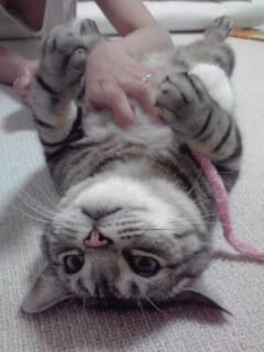 アハハハ…かわいい~。お腹さわられるの苦手な子もいるけどチビちゃんは平気なんですね?うちの子も大好きです。お腹なでるとぐ~んと伸びますよ。
