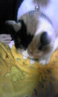 この写真はわたしの布団をおっぱいに見立てて前足をふみふみしながら、布団をちゅうちゅう吸っているところです。赤ちゃんに戻ってます。満足した後布団を見ると、ヨダレでガビガビです