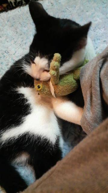 カエルさんの縫いぐるみ、ここあちゃんも好きなんですね。我が家も大好き(笑)キャットニップ入りの奴なんて、抱いて寝てますから(笑)