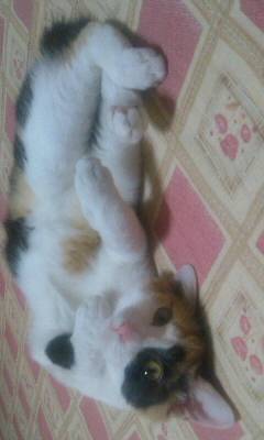 キレイな三毛猫さんですねやさし~い飼い主さん大丈夫ですよ こ~んなにかわゆいポーズだもん きっとふか~いきずなが出来ていっちゃん仲良くなれますよ