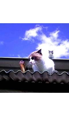 屋根の上に猫ちゃんが居る風景…あたしは大好きですけど。喧嘩は怖いですけどね(笑)それにしても、美しい空の色…。絵葉書にしたいですね