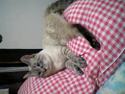 いつもコメントありがとうございます。こちらもだいぶ暖かくなってきましたよ。げべさん、隠していた訳ではないのですが、子猫の時のちゃあの写メは前の携帯に入ってるんですよ。最近になって赤外線通信で今の携帯に送ればいいんだということに気付きまして(気付くの遅すぎ!)ちびっこのちゃあを皆さんに見ていただいてます。NAGO君さん、最近はおかげさまで変な夢は見ていません。ちゃあは私の勤めているスーパーに捨てられていた子です。真冬の寒さの中、氷の上にちょこんと座っていたそうです。初めは別の人が引き取ったのですが、ペット禁止の市営住宅で隣の人に見つかりそうになり、助けを求められて私が引き取りました。猫風邪で目鼻グシュグシュだったんですよ。でもよく真冬の寒さの中、頑張って生きていてくれたなと思います。チャーチャンさん、てんすけさんにもなにか見えるんでしょうか?というかてんすけさんには見えている気がします。エミさん。ちゃあも夏毛は短いんですよ。冬場は脂肪がついている上に冬毛がモフモフなんですよ。これから抜け毛が多くなるし夏場は痩せるから少しはスリムに見えます。INOKIさん、福の神が見えてたらいいですね~。福よ来~い! ネネさん、なにか怖い物が見えていたら嫌ですね~。私は怖い話は好きなんですけど、実際に見えたら怖くて腰が抜けちゃうかも…。みいとさん、ジャージを着た小さなおっさんって幽霊ですか?なんか怖いというか笑える?でも実際に見てしまったら怖いですね。